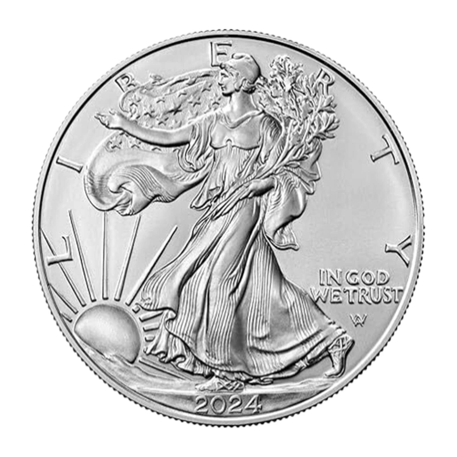 Obverse: Adolph A. Weinman’s famed design depicting Lady Liberty draped in an American flag, walking gracefully as the sun rises over a ridge.