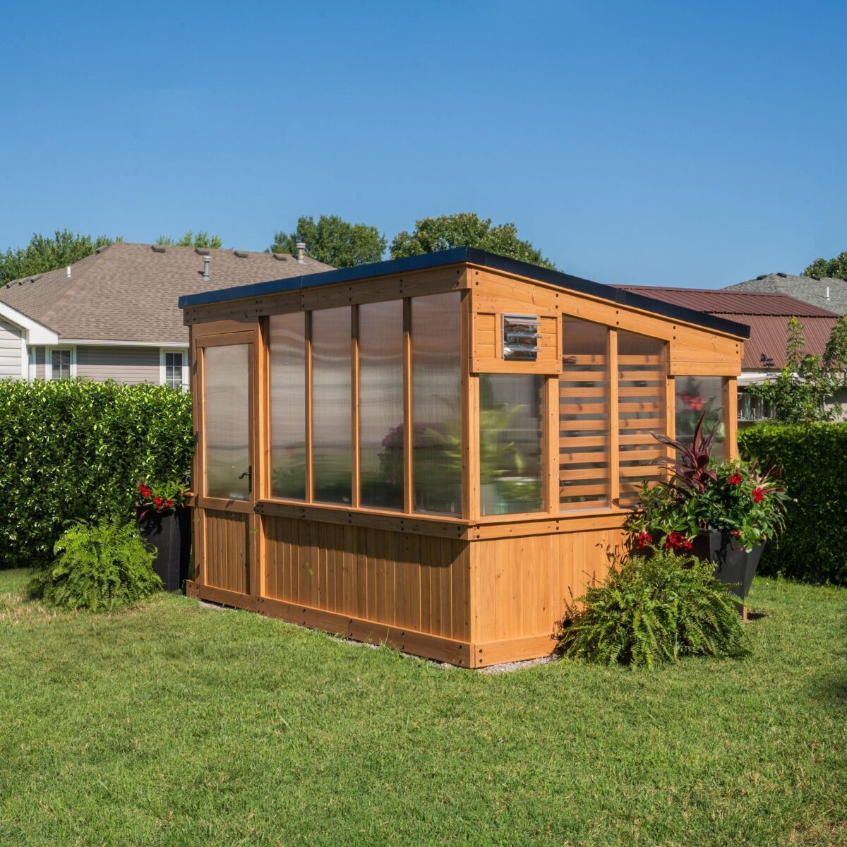 Elevate your gardening with a modern greenhouse masterpiece. Step inside and you’ll discover a spacious interior that invites you to dig into your passion for gardening like never before.