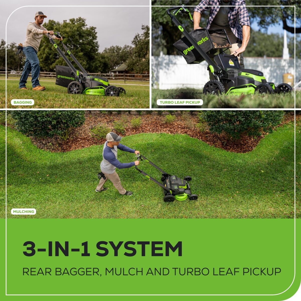 - 3-in-1 System: Mulch, Bag, Turbo Leaf Pickup
