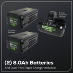 - Includes (2) 80V 8Ah batteries and 8A Dual-Port Charger