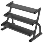 The Axiom Series Flat Dumbbell Rack has a space efficient, 3-tier design that conveniently houses a set of 5 to 50 lbs (2.5 – 25 kg) HEX dumbbells.