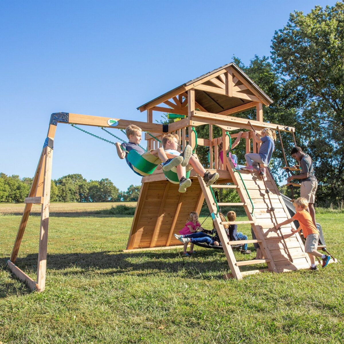 If you’ve got an active kid who loves to climb, our Endeavor Swing Set raises the bar…and the rock wall, and the climbing wall, and the rope ladder!