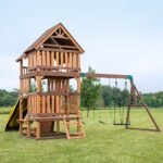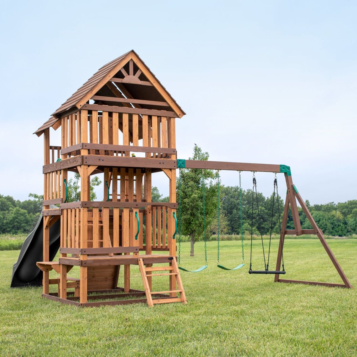 Why stop at two levels of fun when you can have three? Our Highlander Swing Set will lift your littles into a fun, wild world of creative play.