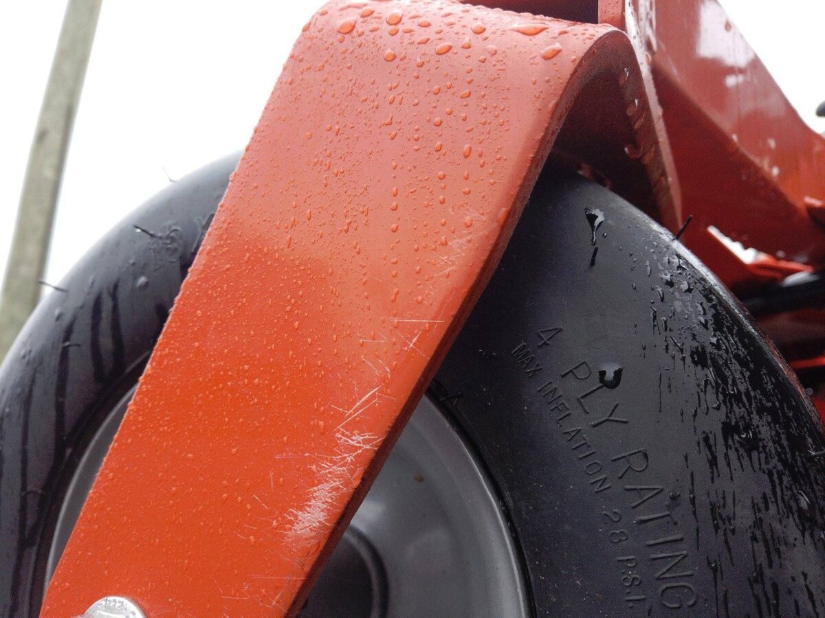6-inch wide caster wheels with pneumatic tires glide easily over turf, reducing scuffing while providing a long service life.