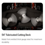 • Durable 54″ 10-Gauge Fabricated Steel Cutting Deck: Built for strength and longevity, this cutting deck ensures precise, efficient mowing on even the most demanding terrains.