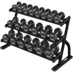 Conveniently store a set of 5 – 50 LB Dumbbells with the Axiom Series 3-Tier Short Dumbbell Rack.
