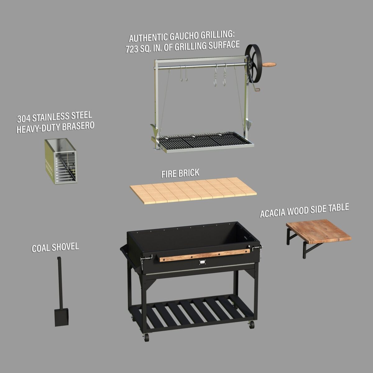 From the traditional Gaucho techniques to Santa Maria precision, this grill is engineered for excellence. It features heavy-duty powder-coated steel, fire bricks, ceramic fire blanket insulation, an acacia wood side table and handles, alongside S-hooks for hanging meat.