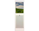 The top section of the Security Boss Patio Pet Door floats on two tension rods that compress or expand to obtain the best possible fit in the patio door frame. The top is fit into the upper patio slider track and the bottom rests on the bottom slider track. Once in place, there are two thumb bolts that lock the top section into place to prevent the Patio Pet door from being removed from the outside.